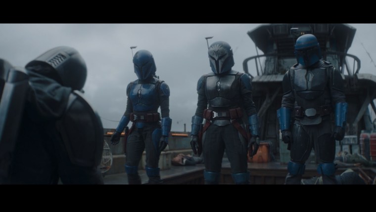 Cela ne plait pas du tout à Mando qui se précipite pour sauver son enfant préféré et qui finit enfermé à son tour dans l’eau, sous le bateau et au-dessus de la créature. Les pêcheurs tentent aussi de noyer notre héros, mais c’est en vain : il reçoit l’aide inattendu de trois autres Mandalorian, tout de bleu vêtu. C’est chouette, mais vous vous doutez bien que la série ne va pas nous ramener trois nouveaux personnages Mandaloriens comme ça.