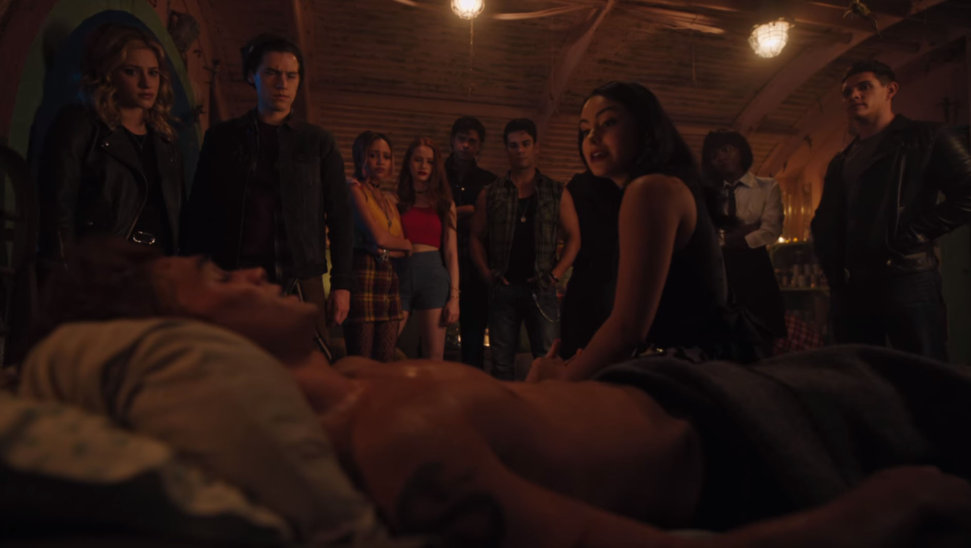 La cicatrice au fer rouge ? Elle est assez basse pour que l’acteur puisse continuer d’être torse nu régulièrement sans avoir à l’exhiber. C’est bien le seul truc qu’il n’exhibera pas, ma foi. Oui, il est de nouveau torse nu pour être soigné par tout le gang, parce que ça y est, tous les adolescents sont réunis pour jurer de garder le secret sur l’emplacement d’Archie.