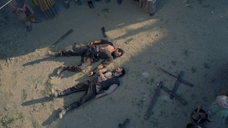 Si elle ne tue pas les deux personnages présents depuis le premier épisode (ça alors), elle est tout de même aussitôt mise en prison. Tobin ? Il réagit comme d’habitude : il se bourre la gueule, puis s’en prend à Garrett, assurant que tout est de sa faute. La scène vire alors au combat entre les deux hommes. Les scénaristes jouent clairement la carte de l’humour, avec un combat ridicule qui continue dans l’auberge où la barmaid est incapable de les contrôler et insiste sur le fait qu’ils devront la rembourser. Ce n’est pas gagné. En plus, publiquement, leur combat est stupide et pas un beau signe d’alliance politique.