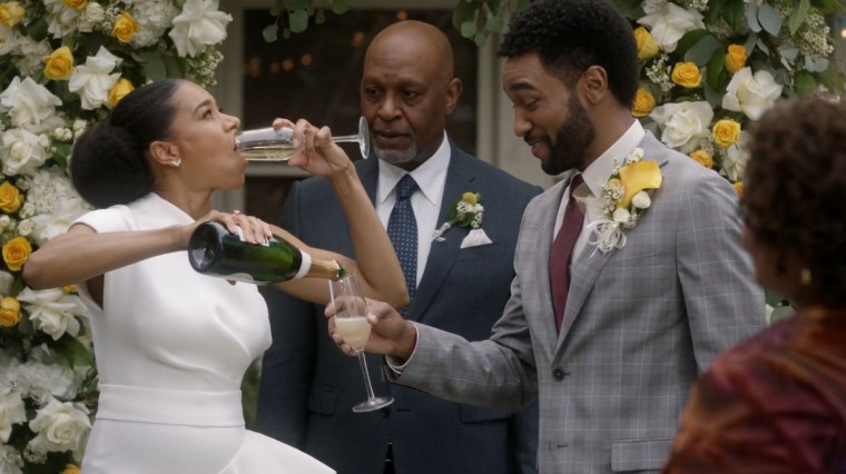 Avril 2021 – Meredith est sur la plage, oui, mais elle n’est pas dans le coma pour autant. Elle est là pour verser des pétales de rose avec Zola. Il s’agit bien sûr du mariage de Maggie et Winston qui peut enfin avoir lieu, comme il se doit. Ben oui.