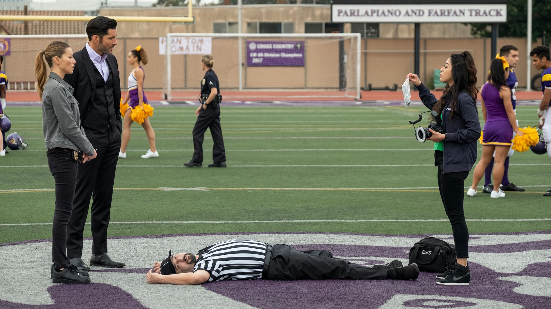 Pendant ce temps, Lucifer et Chloe se rendent arrêter la femme de l’arbitre tué, une prof de chimie évidemment coupable (je veux dire, un sifflet empoisonné, une prof de chimie, ça va quoi). C’était plutôt efficace et sympathique comme scène, avec Lucifer qui finit par arrêter la femme voulant juste les brûler. Soit. Il n’est plus blessé en présence de Chloe, j’avais oublié ça comme les producteurs semblent avoir oublié Trixie. On ne la voit plus assez cette saison, mais elle est toujours là pour nous chanter une petite chanson lorsque Chloe se lance dans des flashbacks de sa relation avec Lucifer.