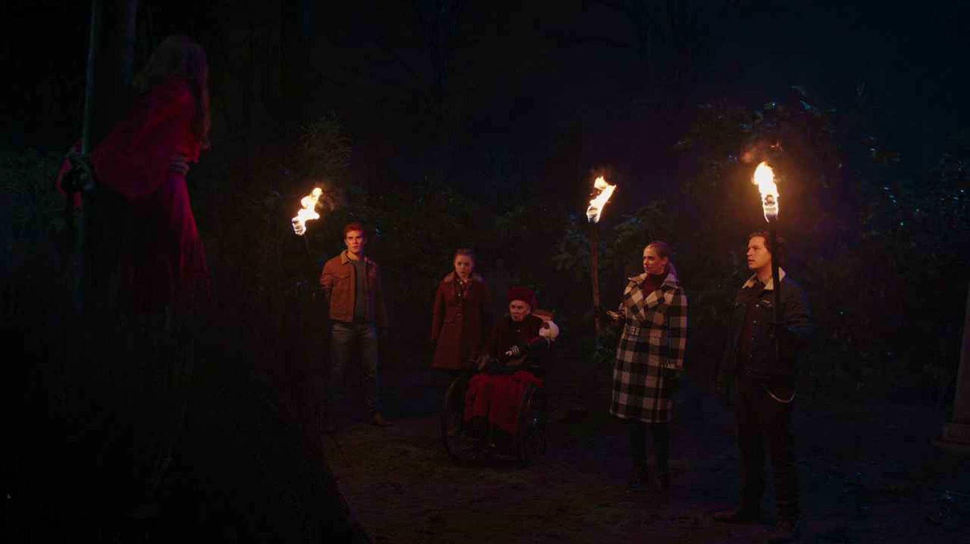 Voilà donc pourquoi il est important de se rendre à l’El Royale pour le conseil des quatre. On notera autrement que l’actrice incarnant Betty a clairement un problème de continuité tout au long de l’épisode. Elle est censée en avoir marre des lumières et ne pas les supporter à cause de son pouvoir, mais elle ne porte ses lunettes de soleil que dans des endroits sombres, jamais quand elle est face à une lumière ou les multiples bougies du manoir Blossom.