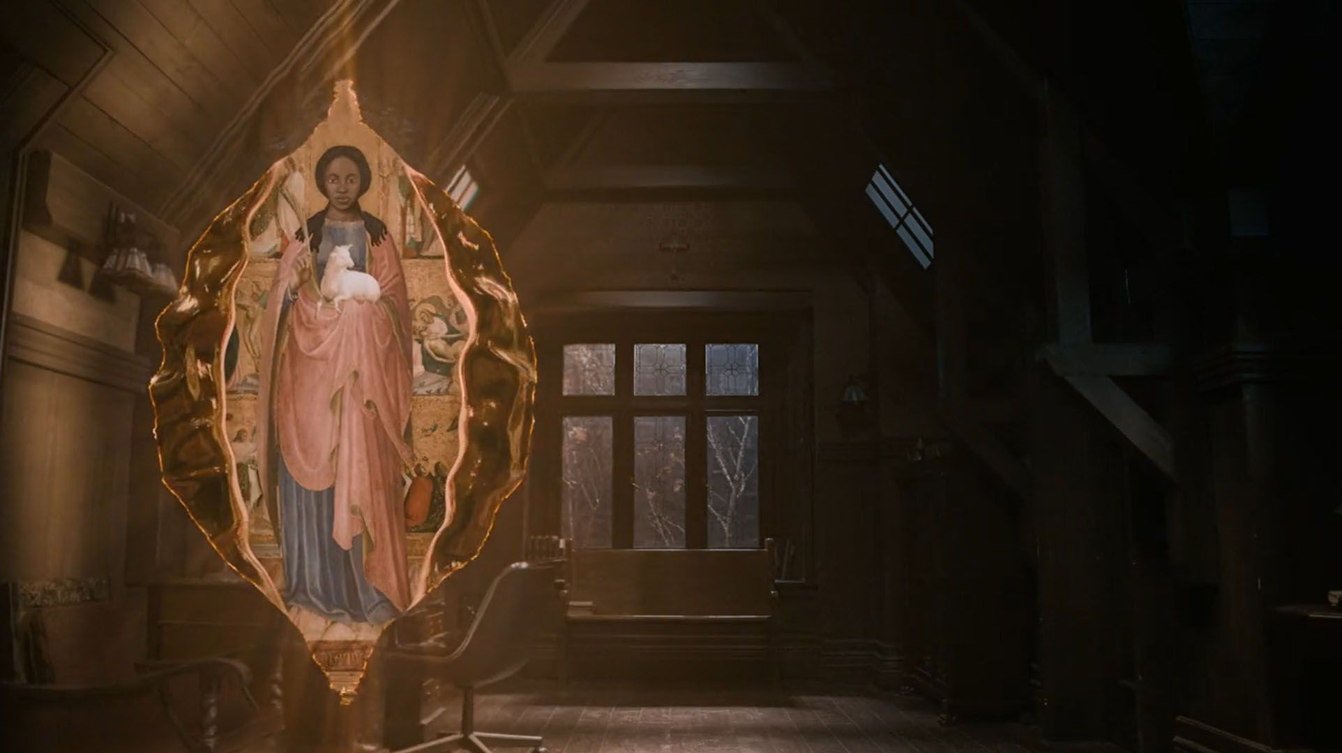 De son côté, durant la nuit, David a une apparition également alors qu’il est au lit : une nouvelle brèche s’ouvre dans sa réalité pour laisser apparaître une femme avec un agneau. La femme est toutefois dessinée de manière religieuse, et elle lui crie de courir, alors c’est plus intrigant qu’autre chose.