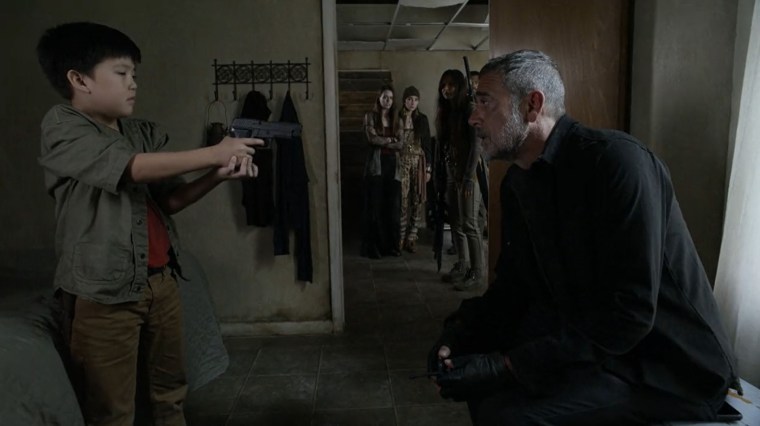 Allons bon. En parallèle, Hershel demande à Negan s’il est un mauvais homme, parce que sa mère lui a dit de se méfier de lui. Il n’est pas trop lent à la détente et comprend bien vite qu’il est face au meurtrier de son père. Il n’en faut pas plus pour qu’il décide de le braquer avec son arme à feu… mais finalement, Negan parvient à le convaincre de ne pas tirer car ça mettrait tout le monde en danger de mort.