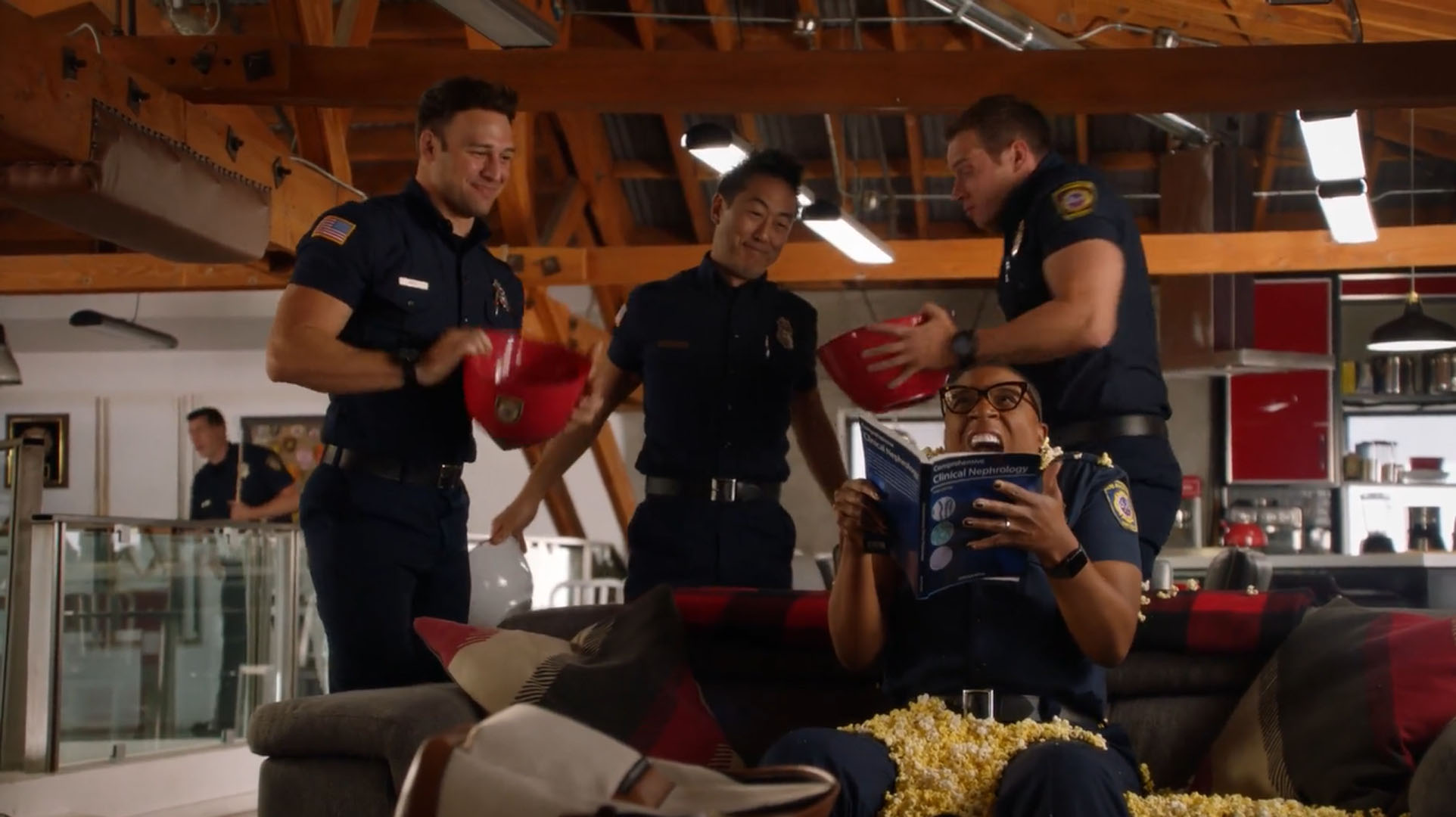 En effet, elle est à fois capitaine et étudiante en médecine. Elle est clairement épuisée et ne doit pas être au top de ses performances à ce stade : elle révise comme jamais, gère la paperasse de la caserne, se plonge dans ses bouquins et gère sa vie de famille malgré tout – et malgré ses collègues insupportables qui ne semblent pas l’aider plus que ça quand ils la noient sous le popcorn. Sérieusement.