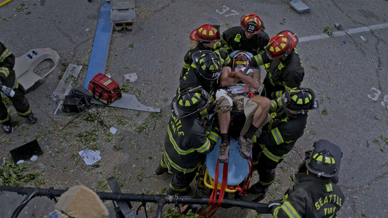 Pendant ce temps, les pompiers sont appelés en intervention parce que l’orage a fait se crasher un hélicoptère. Rien de bien original pour une série comme celle-ci… mais comme nous sommes en mi-saison (déjà, oui – et l’appellation est mauvaise vraiment, on est plus sur un tiers là), il faut que tout dérape.