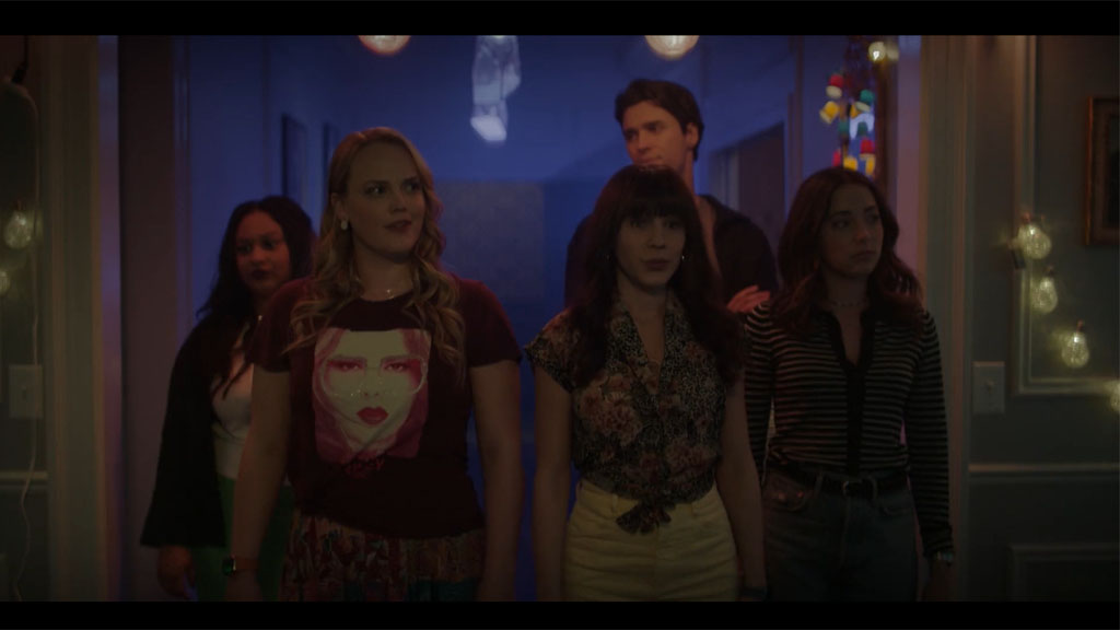 Humph, voilà qui est étrange. Ils sont interrompus par Kim qui souhaite faire le tour de l’appartement avec de la sauge (je crois ?) – en tout cas, avec de quoi purifier l’appartement. Je ne suis pas sûr que ce soit super efficace, parce que ça donne juste une apparition supplémentaire de Jocelyn, dans le couloir. Il n’y a qu’Elena pour la voir, cependant. La soirée reste bizarre pour Elena : elle se retrouve clairement à être la cinquième roue du carrosse, comme on dit. Alex se jette aussi littéralement que possible sur James, Ginny et Kim flirtent aussi ensemble…