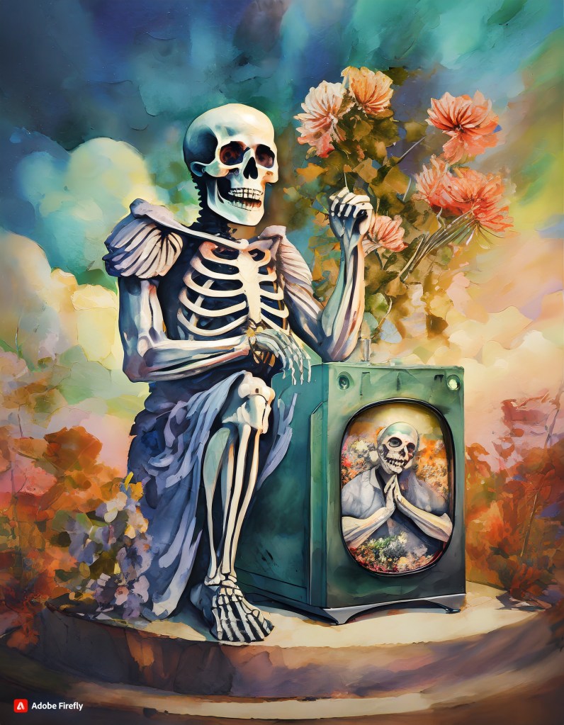 J’adore Adobe Firefly, mais là, j’avoue qu’elle se surpasse ! Un foutu squelette, oui, un squelette en train de binge-watcher une télé qui diffuse… un autre squelette ? Et cette ambiance toute pétée avec les fleurs dignes d’un enterrement ! C’est plus que tordu, mais « ça m’a fait réfléchir à la société haan ».