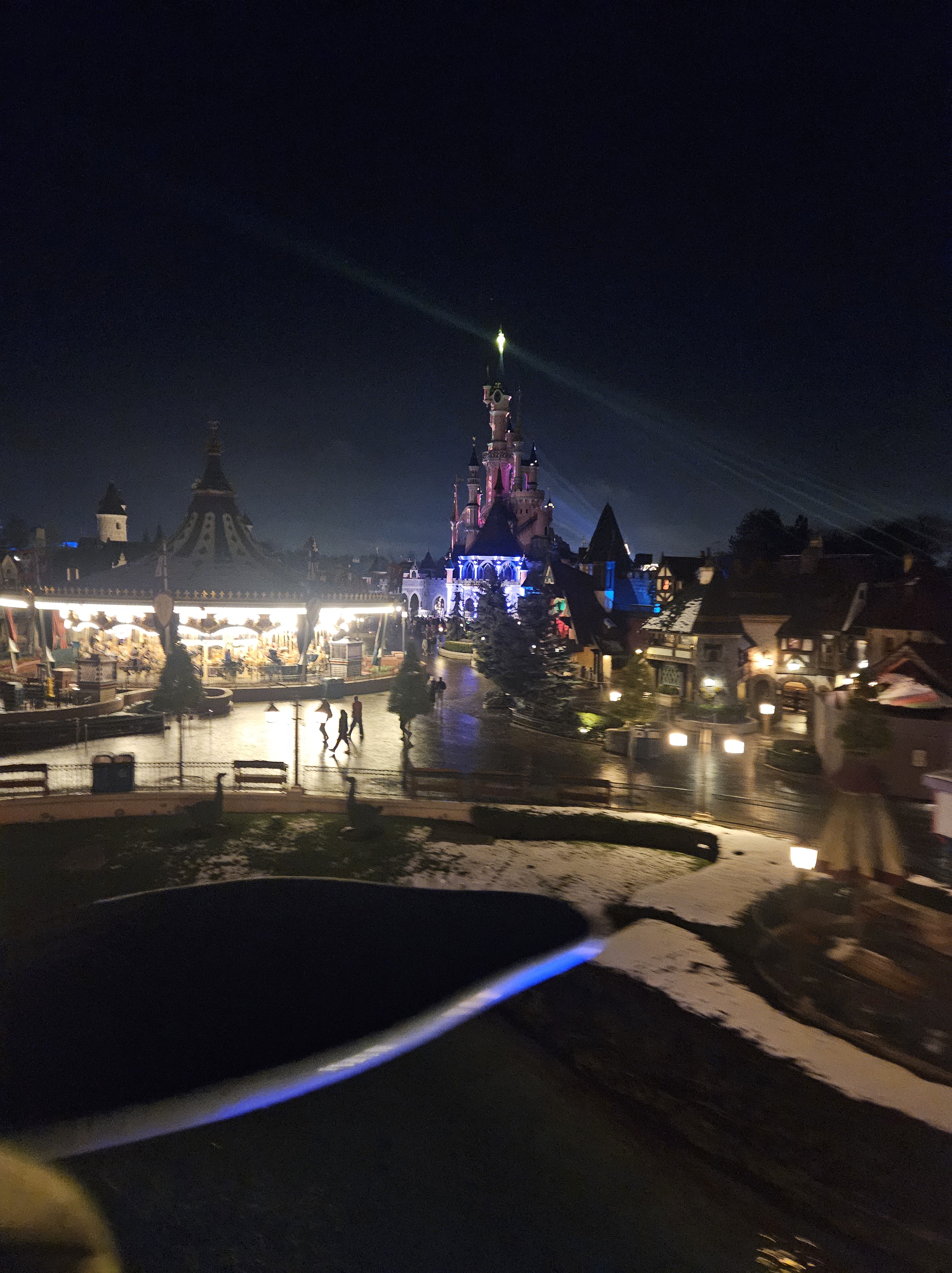 L’une des grandes promesses de cette soirée, c’était les trois spectacles inédits. Finalement, il s’agissait surtout de projections sur le château – et un des spectacles était à deux heures du matin, pour la clôture. Bon. On y ajoute la Sky Parade et Disney Illuminations pour la fermeture du parc au public à 20h, et ça me laissait quand même quatre spectacles à voir. Malheureusement, avec le grand froid de ce 22 novembre (il a neigé la veille), les drones n’étaient pas de sortie.