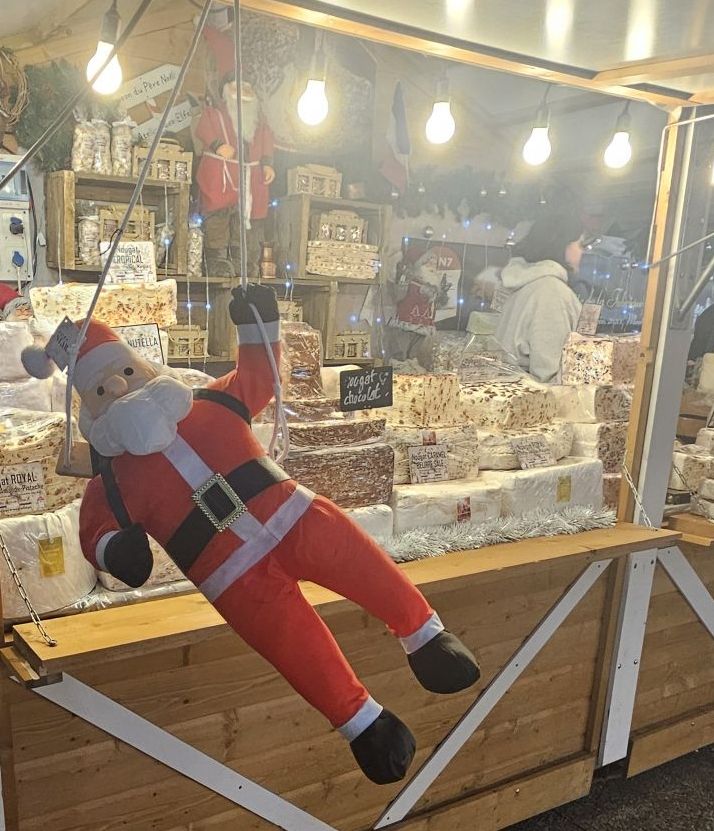 Un Père Noël surprenant : Dès le début, j’ai croisé ce Père Noël en équilibre devant un stand de nougats. Avec ses bras tendus et son air jovial, il m’a immédiatement fait sourire. C’était le cliché parfait pour capturer l’aspect humoristique et décalé des marchés de Noël.