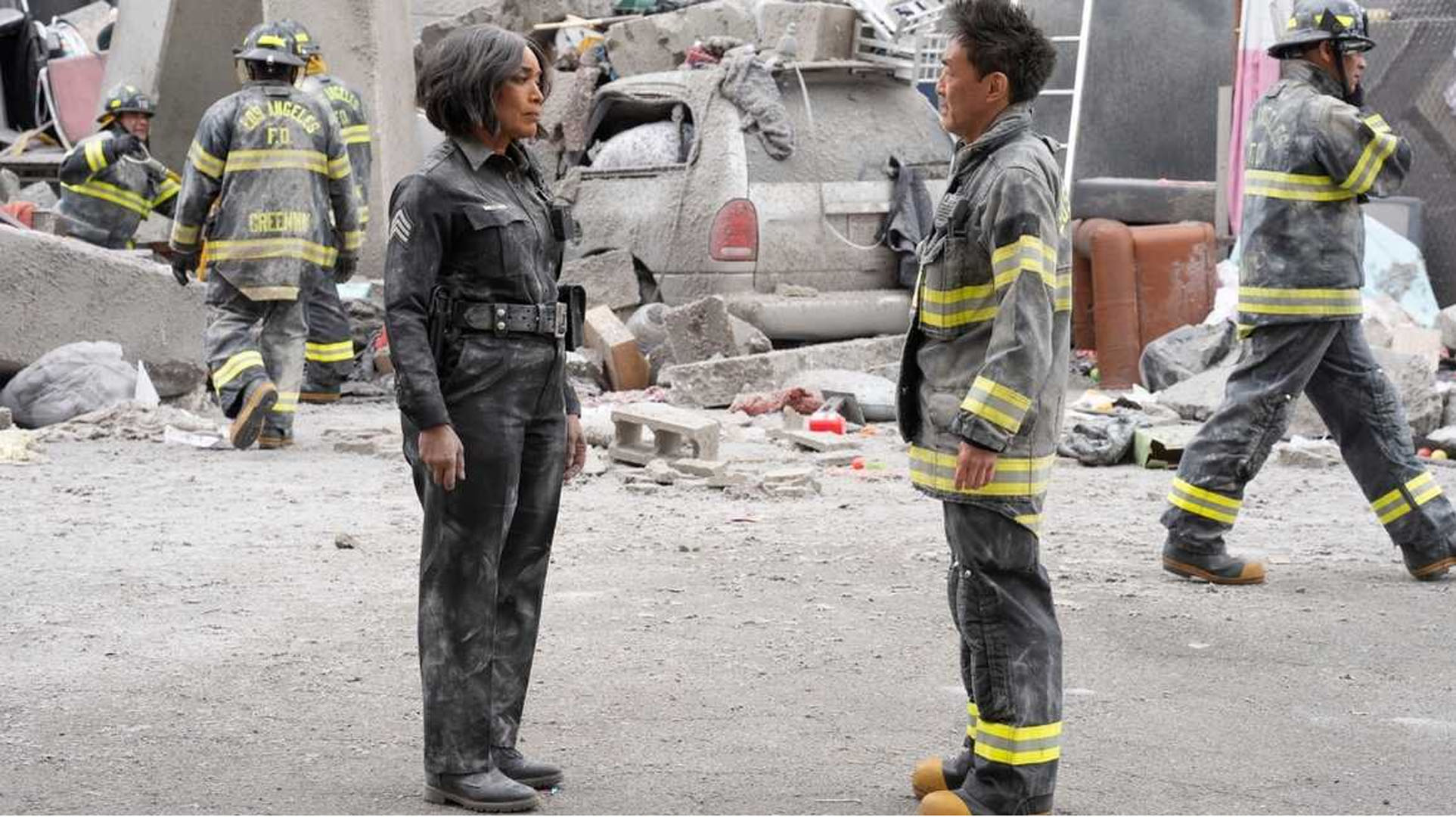 Par chance, Eddie n’est pas encore parti pour El Paso : il débarque sur place avec son ancien uniforme, offert pendant son barbecue d’adieu improvisé. C’est tant mieux : il remet à sa place le vieux capitaine qui devrait retourner bien vite sur le tournage de sa série et lui fait des grands discours à la Bobby – et de Bobby. Il peut bien se le permettre : il n’est pas vraiment son capitaine. Eddie débarque à temps pour venir en aide à Ravi et Buck. Il leur tend une ligne qui permet de les sauver. L’immeuble menace pourtant de s’effondrer un peu plus – et le fait d’ailleurs quand Buck est sauvé in extremis.
