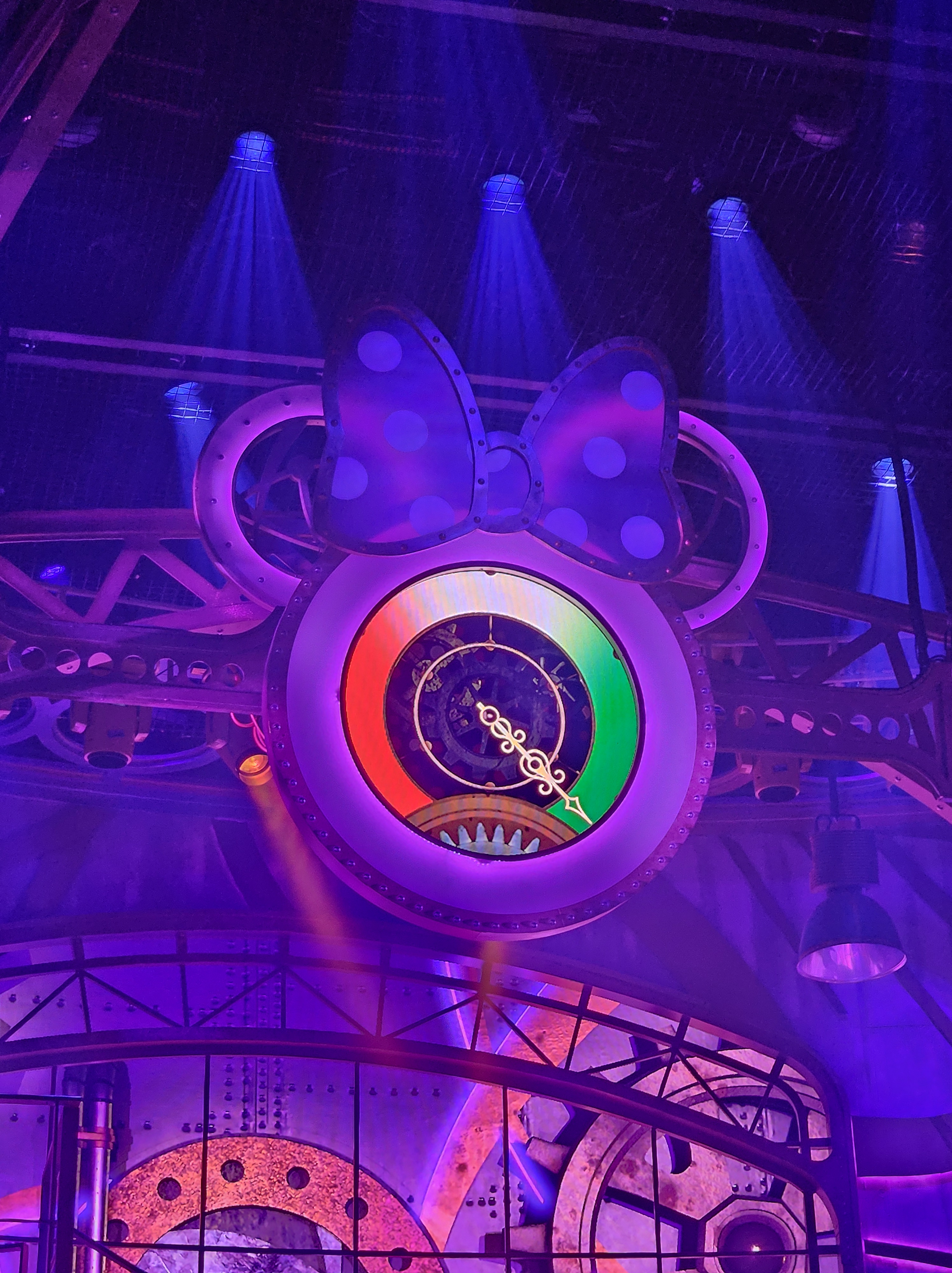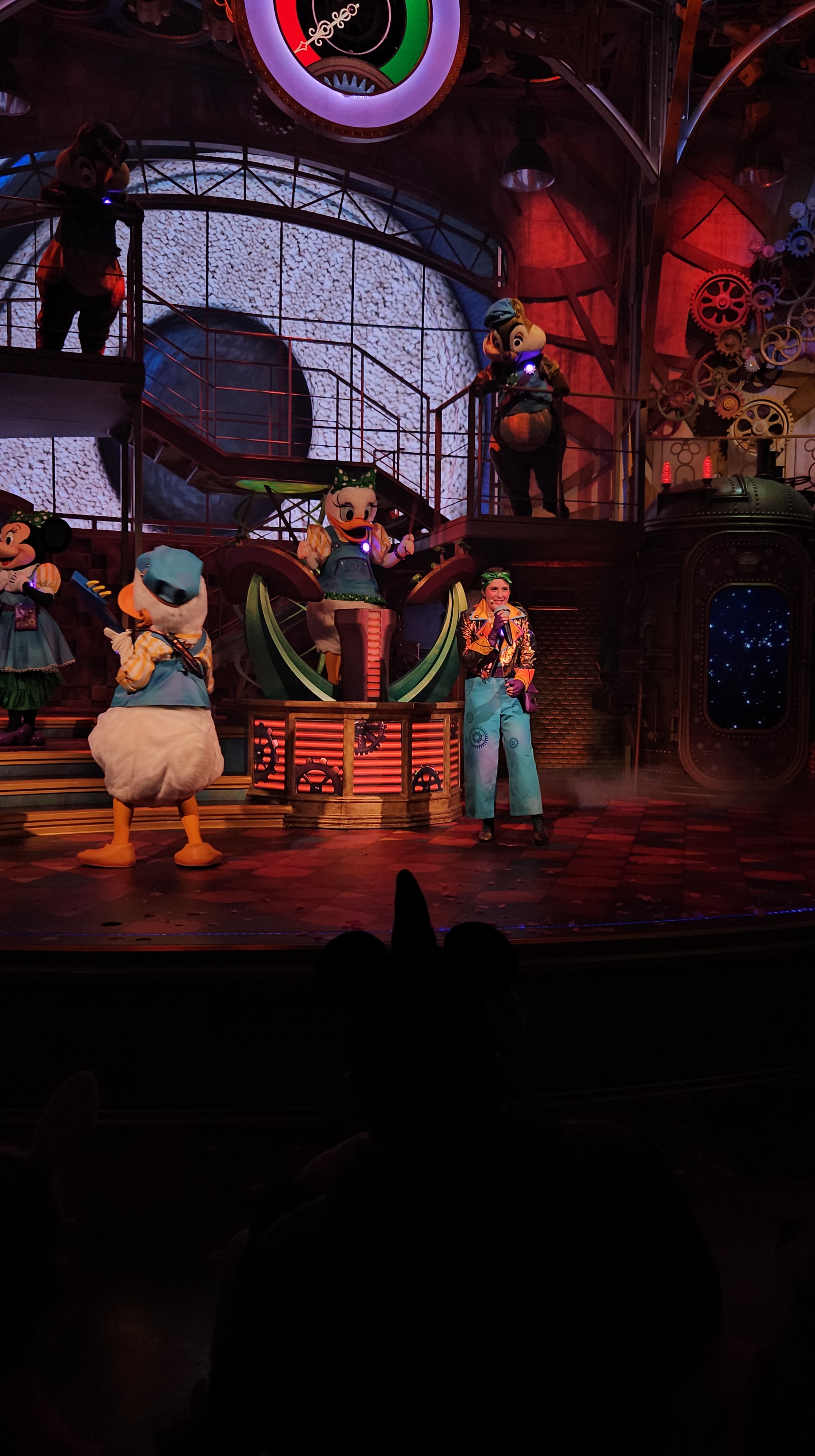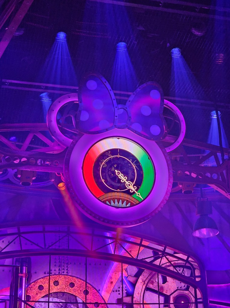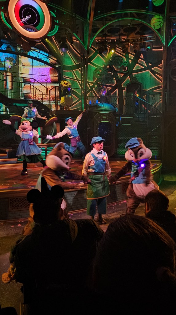 La scène est toujours aussi magnifique : ses rouages, ses éléments mobiles, ses jeux de lumière. Un détail saute aux yeux cette fois-ci : la grande tête de Mickey qui dominait auparavant la scène porte désormais le ruban de Minnie. Un changement simple, mais très symbolique pour ce nouveau spectacle. Le décor évolue, sans perdre ce qui faisait son charme.