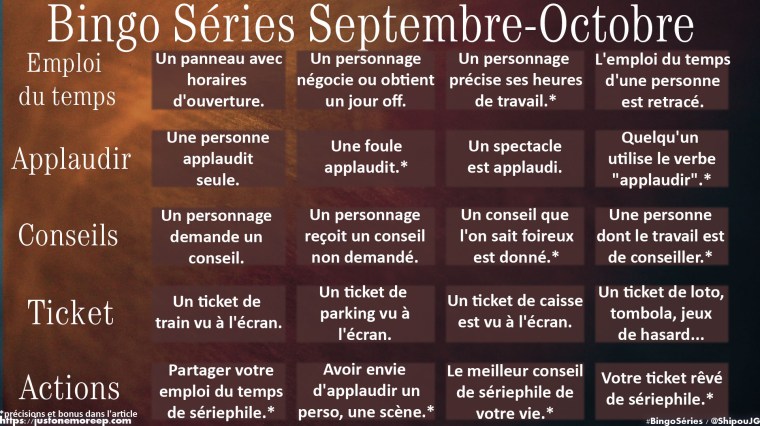 J’ai attendu ce thème pendant des mois, et j’ai bien cru que je n’allais pas réussir à en faire quelque chose de bien. Finalement, ça va, ça s’est bien passé – mais j’oubliais tellement le Bingo que j’ai failli finir sans psychologue. À nouveau, Riverdale et Plus Belle la Vie m’ont offert l’ensemble des points dont j’avais besoin – je veux dire, je ne m’attendais pas à entendre parler de phytothérapie ce mois-ci, mais ça collait vachement bien au point 16 tout de même.