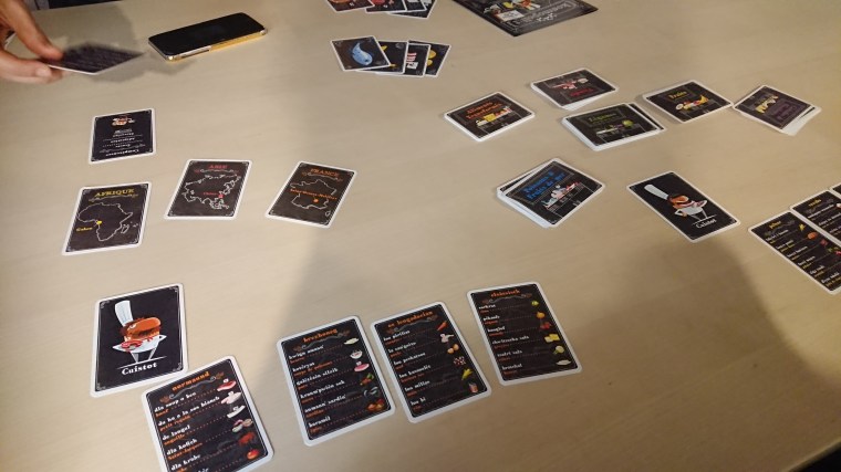 Les cuisiniers (jusqu’à 6, ce qui porte au total le nombre maximum de joueurs à 8), eux, ont devant eux toutes les cartes de plats liés à un continent. Plus on est nombreux à jouer, plus il y a de continents et de plats, donc. Sur chaque carte, les plats sont notés de manière lisible pour tout français, même si une partie des dialectes utilisés n’ont même pas d’orthographe et d’écrit. Reste alors à trouver le plat qui est demandé par le maître d’hôtel.