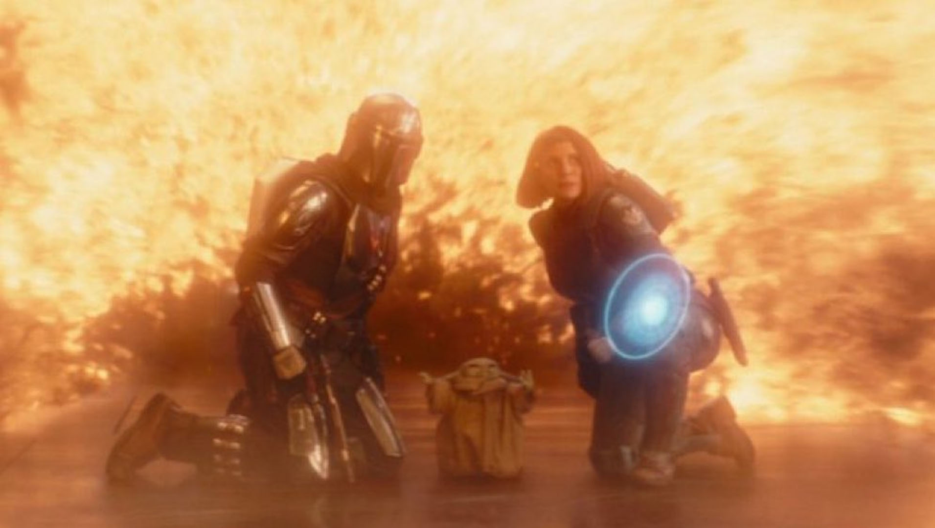 Cependant, pour s’en débarrasser définitivement, il faut encore compter sur le crash du vaisseau-mère qui, comme par hasard (ou parce qu’il est bien piloté), tombe pile sur l’ancienne Forge. L’explosion est impressionnante et le petit bouclier de Bo-Katan pour faire face aux flammes m’a bien fait rire. Elle ne peut protéger Grogu et Din Djarin, mais on peut compter sur Bébé-Yoda pour utiliser la Force et créer un joli bouclier qui les protège. Bien sûr, Gideon n’a pas cette chance et meurt dans les flammes.
