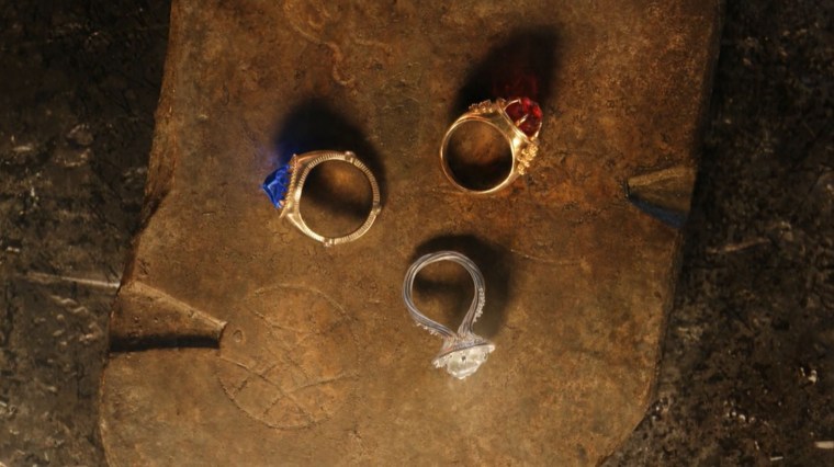 Cela prend bien beaucoup de temps, et ça en laisse assez pour qu’Elrond fasse 1+1 et comprenne la vraie identité d’Halbrand, retrouvant l’arbre généalogique dans le fleuve. Il ne confronte même pas Galadriel, cependant : quand il vient la voir, les trois anneaux des elfes sont enfin prêts à être portés. Bon, les trois personnages ne ressemblent pas tellement aux acteurs vus dans l’introduction de la trilogie, mais on sait bien que ce sont eux qui les porteront.