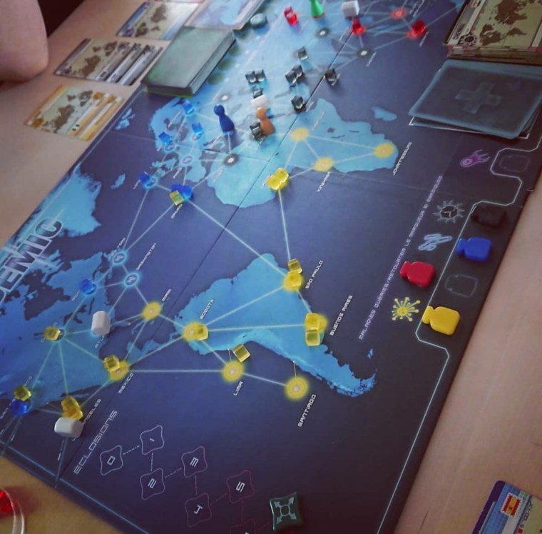 On garde le même but – sauver le monde d’une pandémie ou deux – mais on change totalement la manière de jouer. Au lieu d’avoir un plateau représentant le monde, le plateau représente l’intérieur d’un avion. Pourquoi ? Vous et votre équipe êtes à bord d’un avion, tout simplement, et vous avez pour mission d’apporter des ressources aux quatre coins du monde pour aider les grandes villes à faire face à des éclosions de virus.
